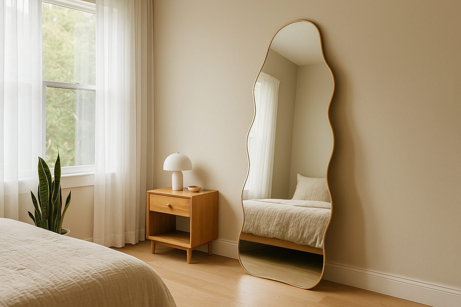 Yumuşak kıvrımları ve sıcak tonları yaşam alanınıza taşıyın. El yapımı bu dalgalı kenarlı düzensiz ayna, ince ve estetik çerçevesiyle organik bir silueti sarar. Yatak odalarında, antrelerde ve oturma odalarında tam boy yer aynası ya da duvara monte dekoratif bir parça olarak mükemmel bir şekilde uyum sağlar.